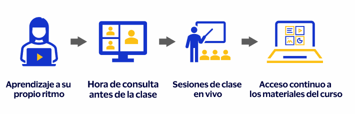 Nuestro nuevo modelo de aprendizaje combinado ofrece la flexibilidad del aprendizaje a su propio ritmo combinado con la participación interactiva de sesiones en vivo dirigidas por instructores, brindándole una experiencia de aprendizaje rica e integral.